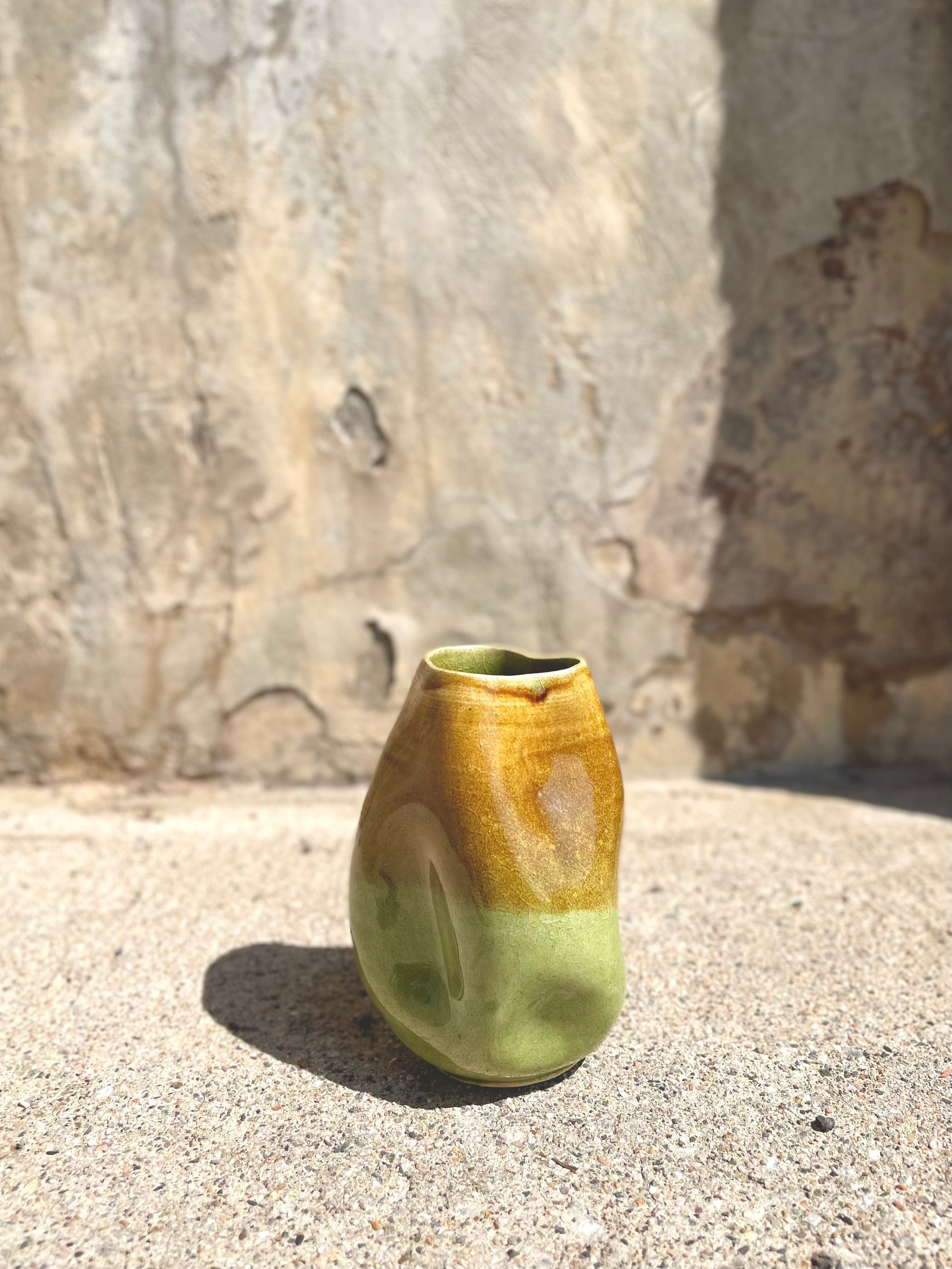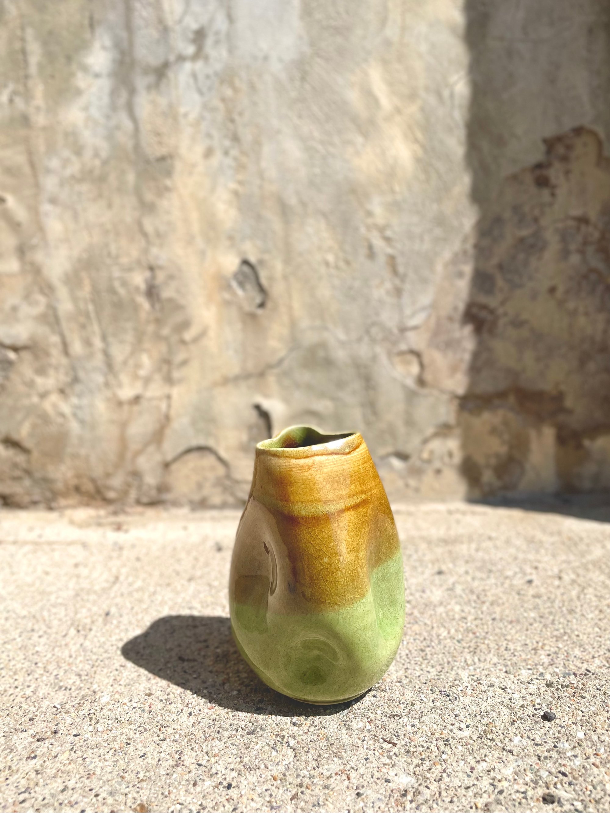 a small, melty, organic bud vase with green (celadon) and brown (desert sand) glaze on white buff clay
