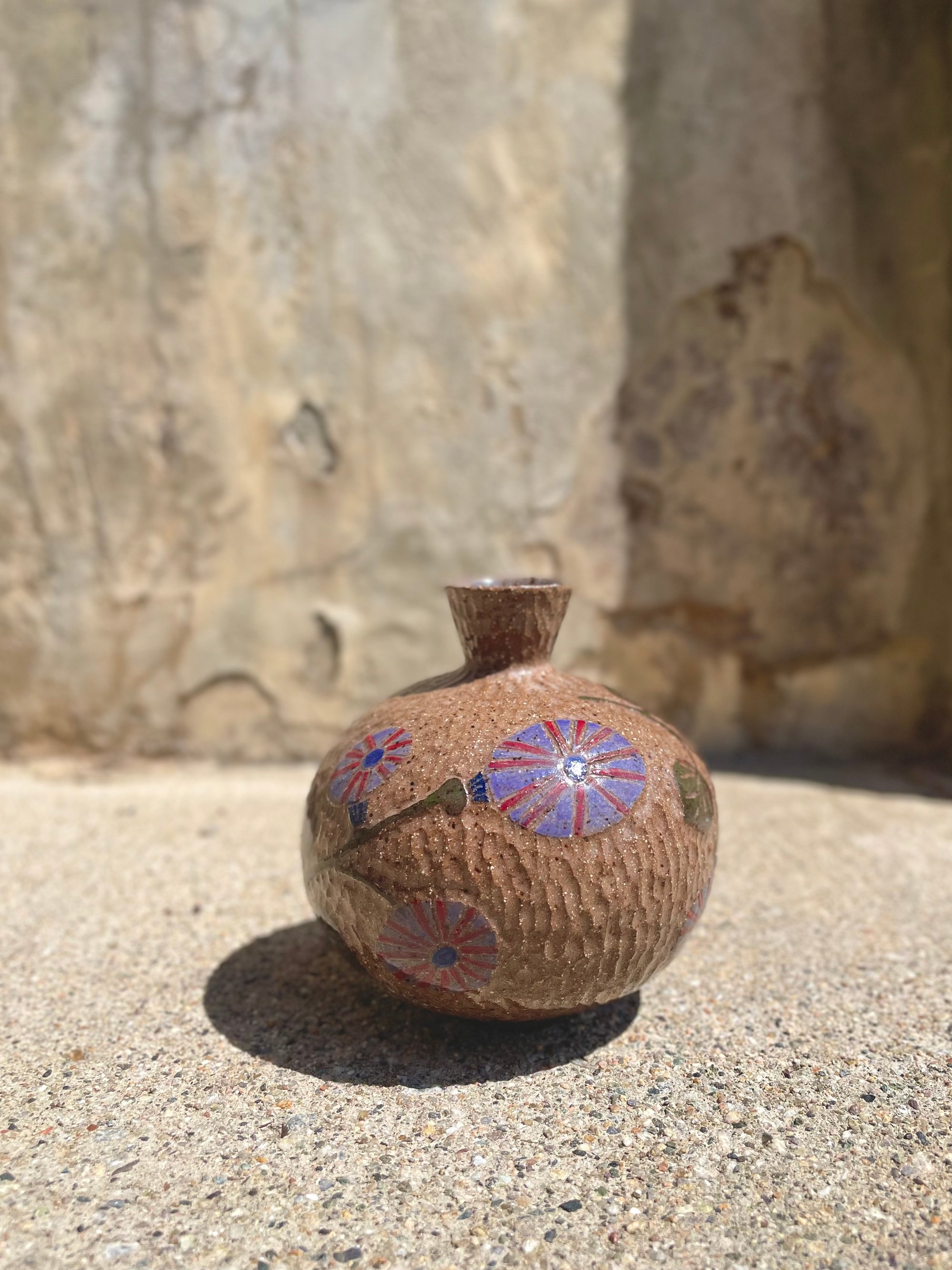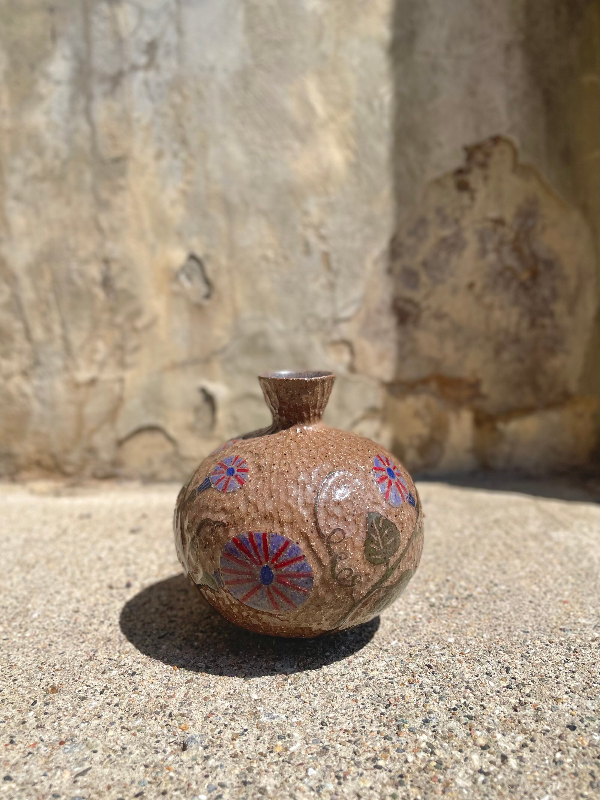 small bud vase with hand-carved graphic petunias on brown speckle clay