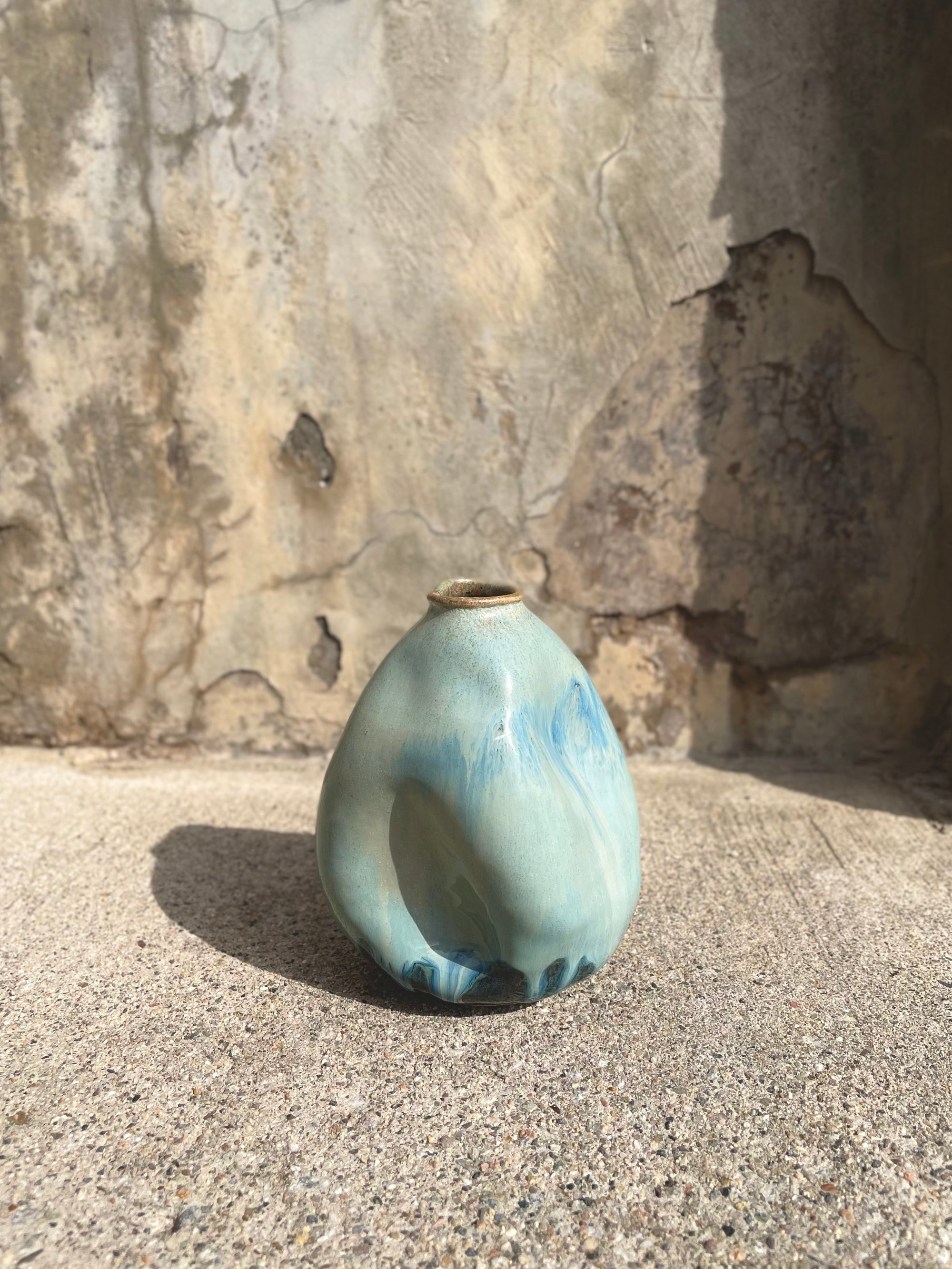 symmetry-defying vase, melty and drippy with glaze, in white clay