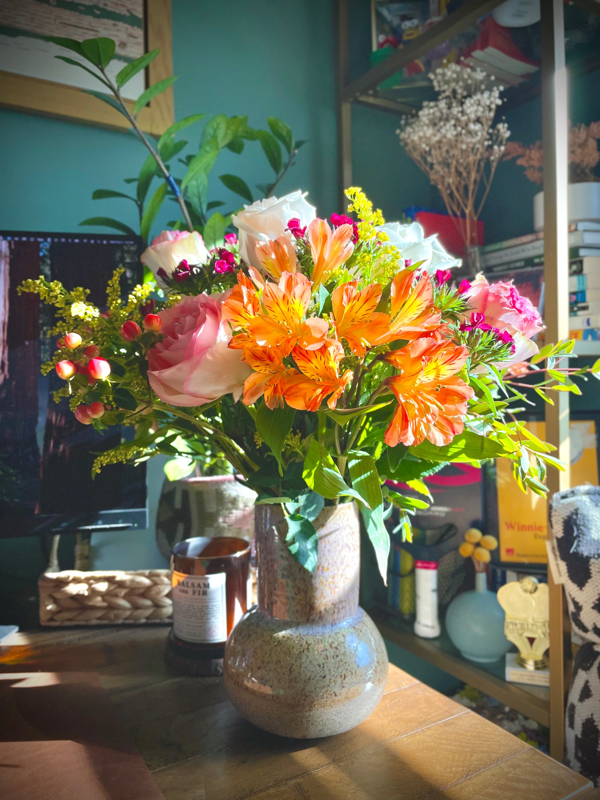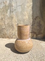 vase shaped like a florence flask; with almost iridescent glaze on brown speckle clay, left raw at the bottom