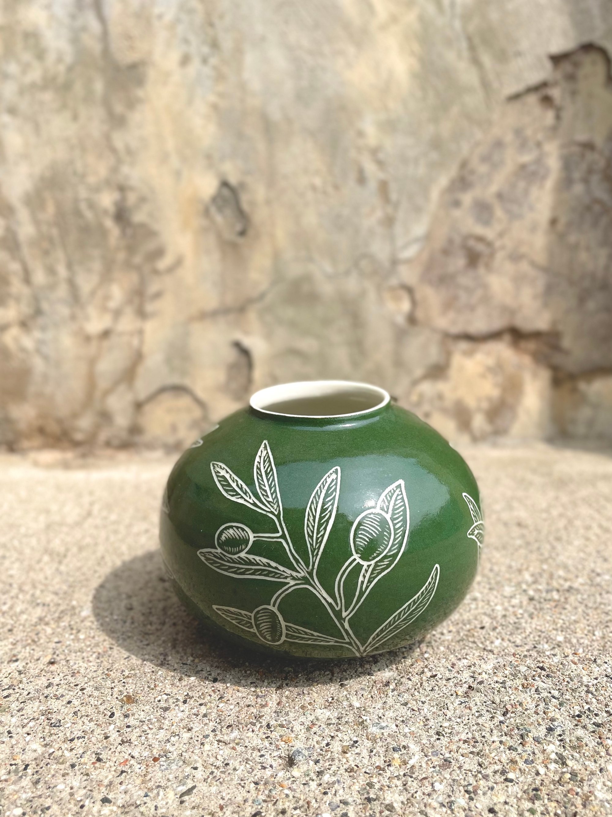 moon jar with hand-painted and olives on porcelain, inspired by the flora from a trip to greece