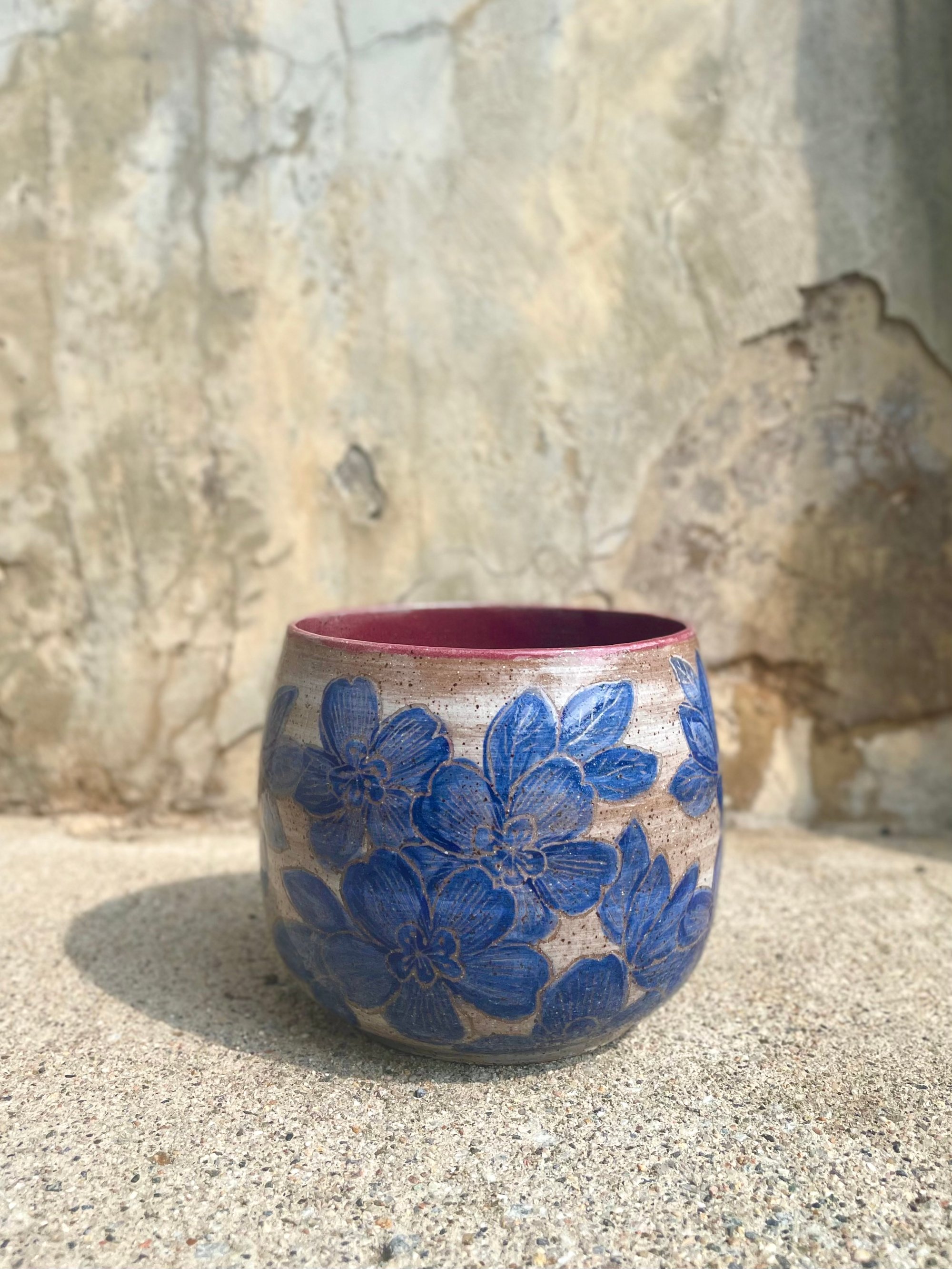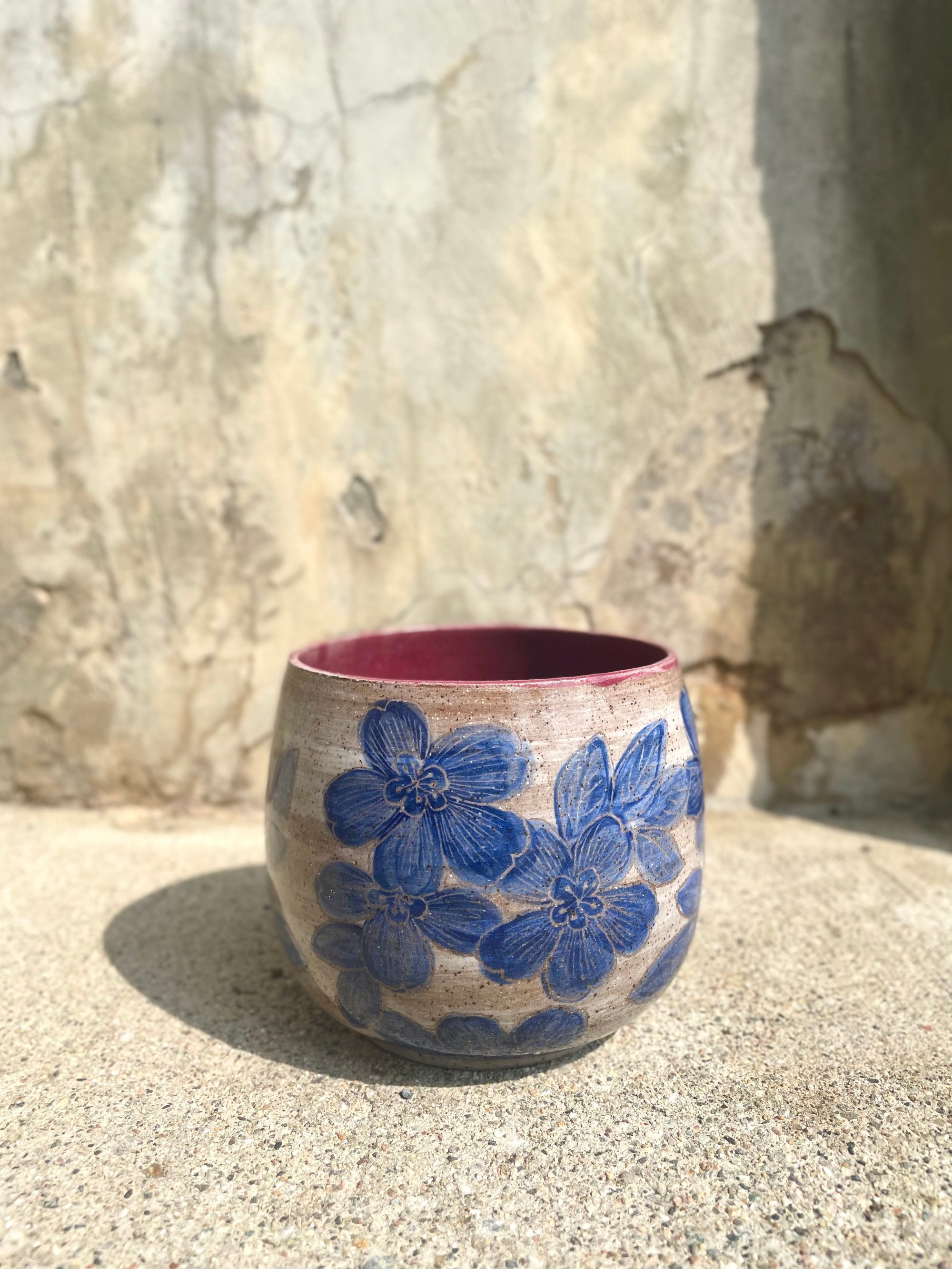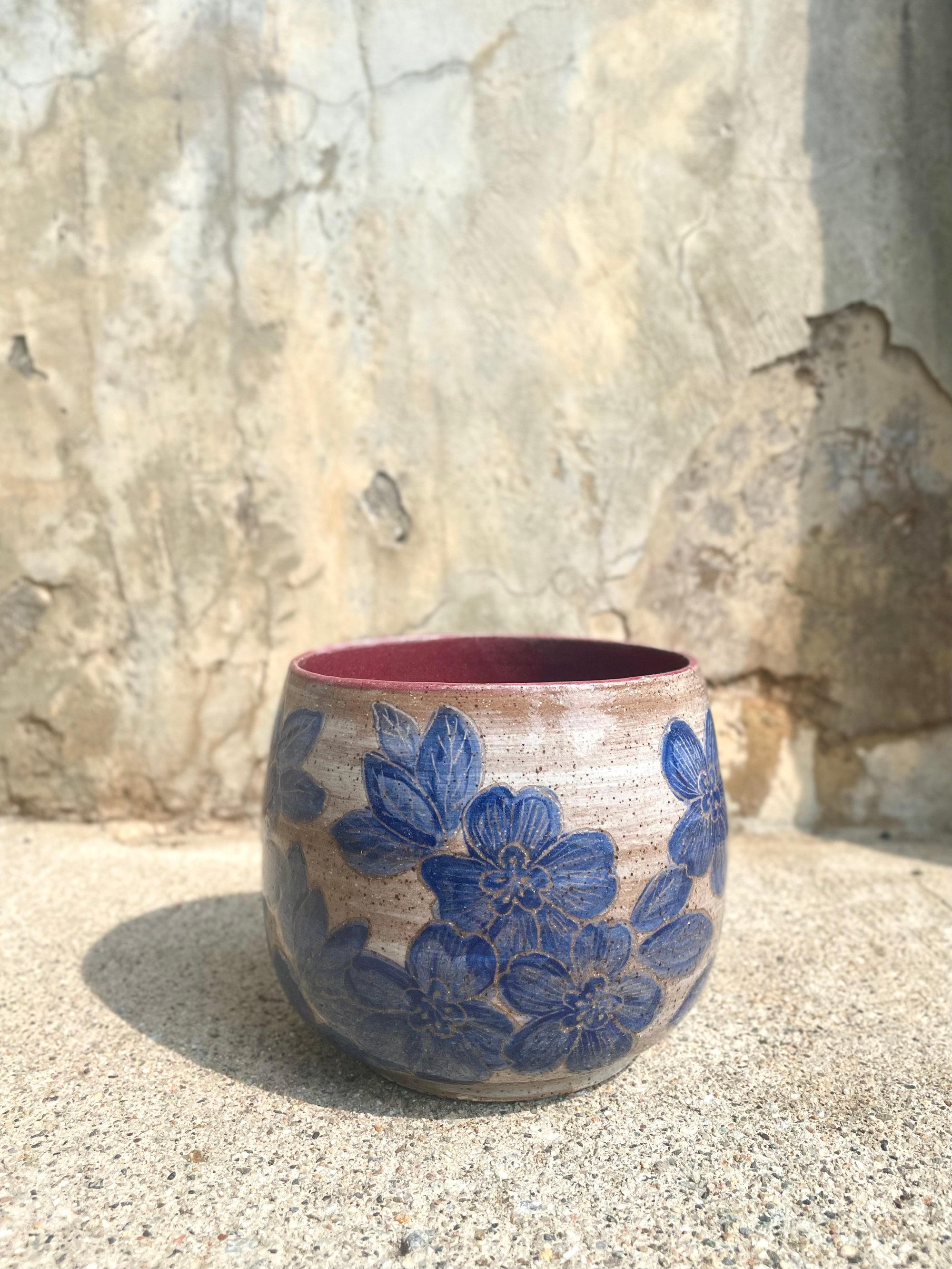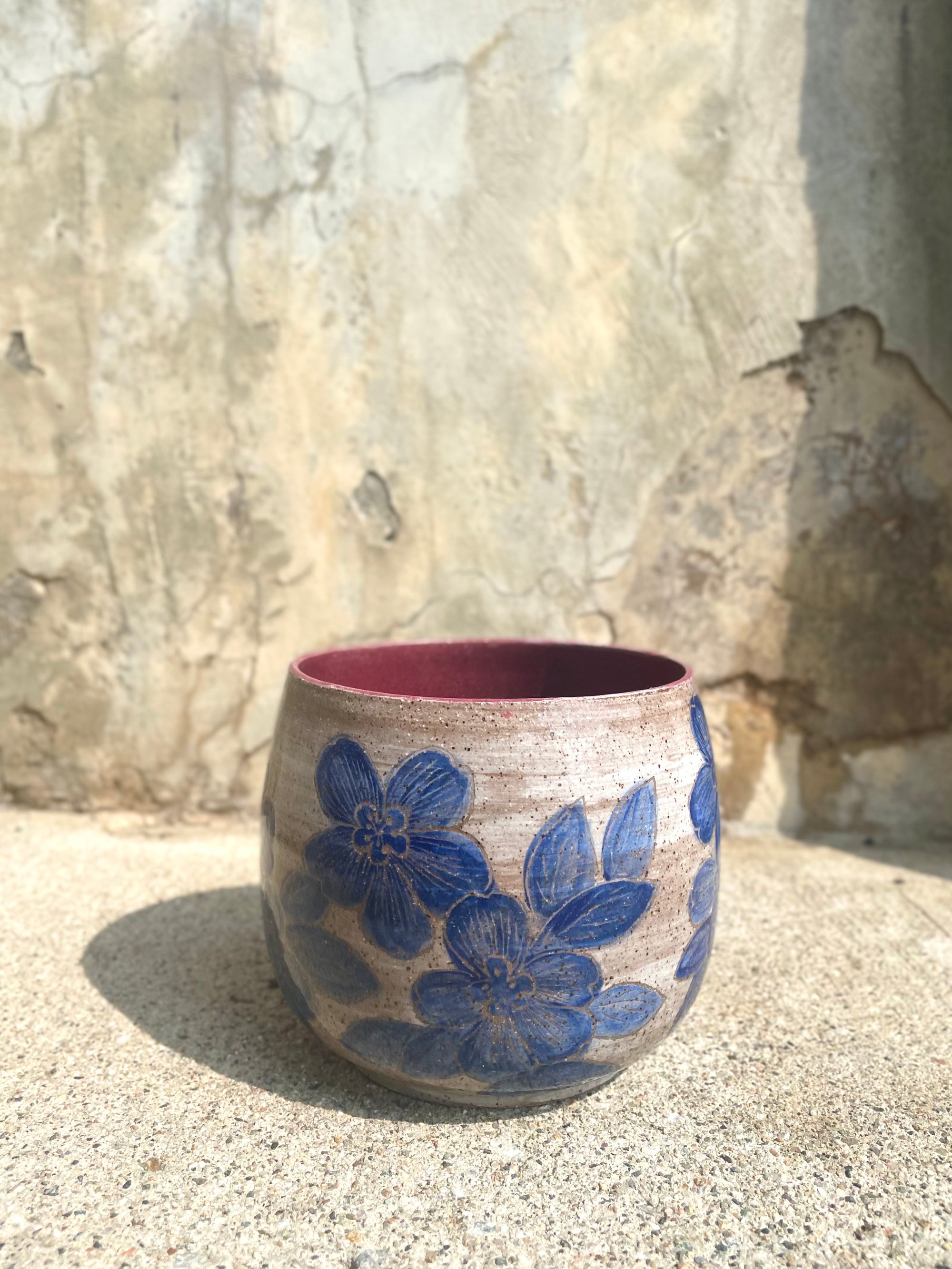 planter (no drainage hole) with blue carved cherry blossoms on white painted background on brown speckle clay; cranberry glazed interior